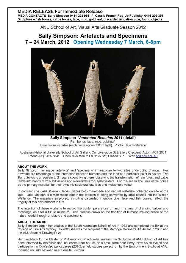 Artefacts & Specimens. Sally Simpson. 7 – 24 March 2012. ANU School of Art, Canberra Share this:Tweet Click to email a link to a friend (Opens in new window) Email Click to print (Opens in new window) Print Like Loading...