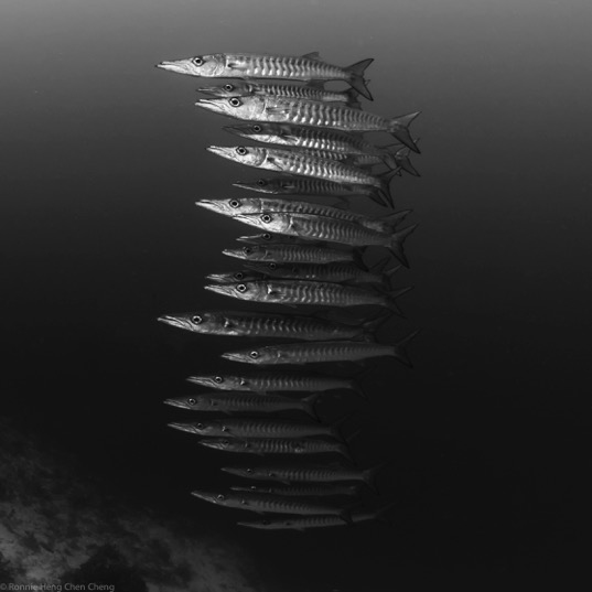 This collection of mostly black and white photographs, with only a few in colour, are poetic and beautiful. You can almost feel like you are floating yourself deep in the sea, looking up as shoals of fish move above you, or you are staring at the giant underside of a manta ray gliding by, or witnessing the quirky line formation of a little school of yellowtail barracuda (above) – simple, magical, stunning photographs. Heng is not only a highly skilled underwater photographer, he is also a regular ocean swimmer and diver.