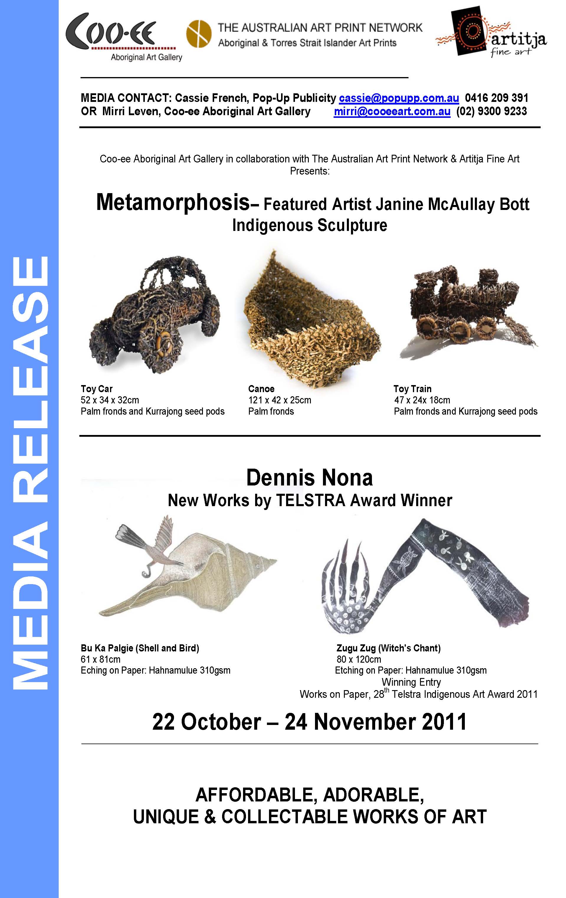 Metamorphosis. Sculpture & Prints. Dennis Nona at Coo-ee Aboriginal Art Gallery, Bondi. Until 24 November 2011 METAMORPHOSIS Press Release general Share this:Tweet Click to email a link to a friend (Opens in new window) Email Click to print (Opens in new window) Print Like Loading...