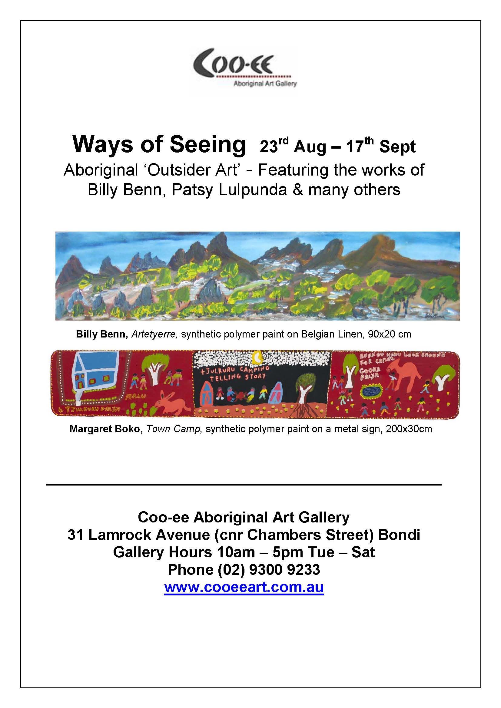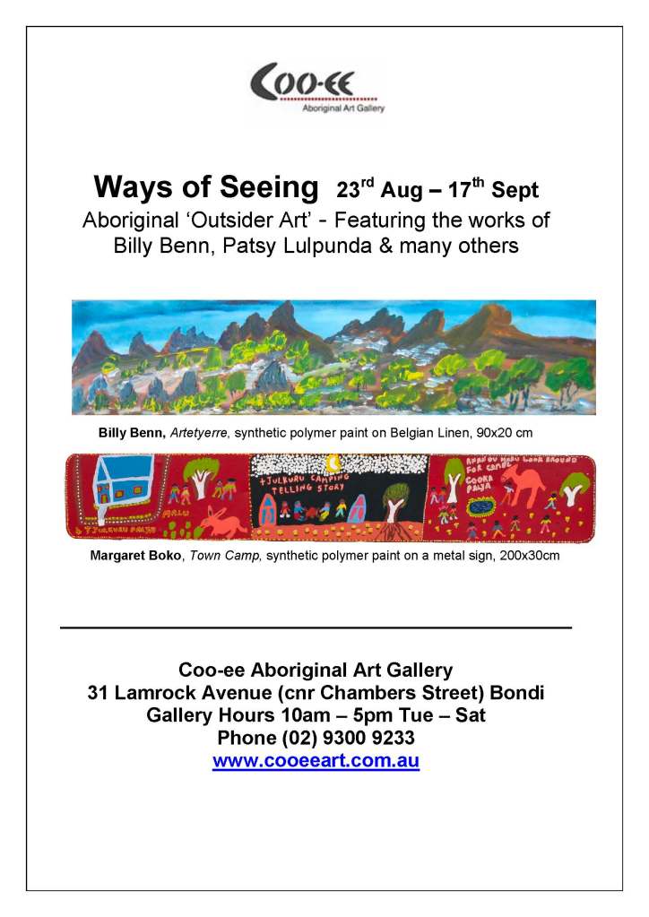 Ways of Seeing: Outsider Art. Coo-ee Aboriginal Art Gallery, Bondi. 23 Aug – 17 Sept 2011 Share this:Tweet Click to email a link to a friend (Opens in new window) Email Click to print (Opens in new window) Print Like Loading...